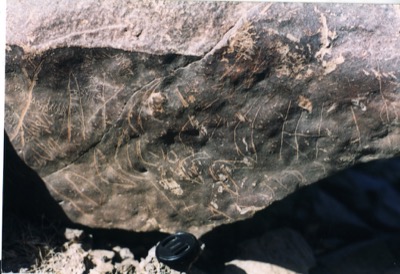 Notes: Ǧabal Says consists of a volcanic cone within a much larger crater. The latter contains the ruins of an Umayyad palace and a semi-permanent lake. De Vogüé (1868–1877: 142–143) found only 2 Safaitic texts (C 3, 3bis) and some Kufic inscriptions by the ruins and Dusaud and Macler found none. None of these seems to have climbed to the top of the inner crater. Von Oppenheim (1899–1900: i, 245), however, reported large numbers on the south-east slope of the inner crater and particularly on its summit, but did not record any. C 5–104 were copied at Ǧabal Says by the Dunands, with no indication of their exact provenance. Safaitic inscriptions and at least one Greek text are to be found all around the rim of the cone and are particularly numerous on the north, north-east and south-east parts, overlooking the lake. Both published (Dunand) and unpublished texts were found on this section of the rim, as well as C 296–298 which are among those (C 292–321) said in C to have come from "the region between Ǧabal Says and Zalaf."