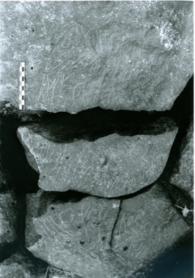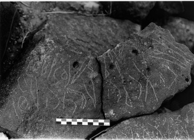 Notes: Al-Mrōshan consists of four long, low mounds, running roughly east-west in a flat area where the Wādī al-Gharz spreads out. These mounds create a series of "gorges" perhaps 3 m high in the wadi which is otherwise very flat and at this point hardly distinguishable from the surrounding area, the "wadi-bed" consisting of several channels approximately 30–80 cm deep and 4–10 m wide. The southerly three mounds are covered with graves and enclosures. Much of the rock is not suitable for inscribing. It was visited in 1995 by the Safaitic Epigraphic Survey Programme and all the published texts it rediscovered came from the most northerly of the southern three mounds, and most were concentrated at its eastern end.