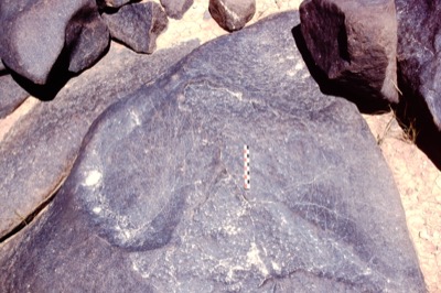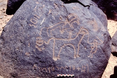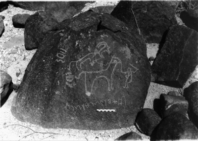 The text which is in Thamudic B is carved below the drawing. The claim to h-s¹fr w h– frs¹ is unusual. The forms of the l, s¹ and f are typical of Thamudic B but are also found occasionally in Safaitic.