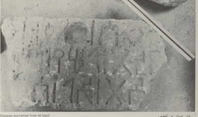Notes: Jamme (1967: 186) quotes James P. Mandaville, who sent him the photograph: 'inscription discovered in the town of al-Qatif, August 1966. Found by workmen digging a ditch about 50 metres west of the Admirate building at a depth of 40 inches below street level ... stoine is now in custody of Qatif Municipality.' (Letter to Jamme 21-08-1966).
