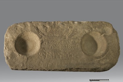 Macdonald & Al-Najem (2016): "Large (120 x 47 x 21 cm) with a hollow at each end of the inscribed face, similar to the example from Qaṣr al-Ḥamrāʾ shown in situ in Abu-Duruk 1986, pls 36/2, 39/1–2, 47/1–2, and fig. 10/XX, though, unlike these, TM.T.024 is intact. The inscriptions are between the hollows. Lines 1–4 are chiselled. Line 5 is lightly scratched. Not previously unpublished.