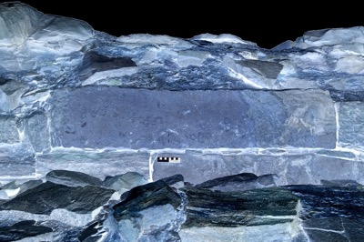 A large rectangular slab of greenish sandstone in the western wall of the "temple".