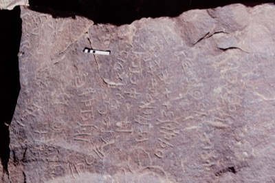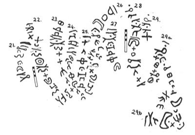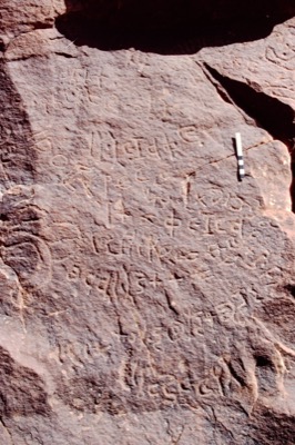King (1990: 184–185) commented: "The text begins to the right of KJA 27 and is written in a zig-zag turning up towards KJA 29a and then turning down towards KJA 29b. For other texts using nyk, see Ch.4.E.2. The rest of the text after ġlmt is ambiguous. ʿṣ might be the name of the woman (Harding 1971: 422) in apposition to the substantive. On the other hand, the verb nk in KJA 24 is followed by an adverbial expression and I have translated ʿṣ from Ar ʿawiṣa ‘it became difficult’ from which a verbal noun ʿayṣ is attested although rarely (Lane 2196b). f, is the particle fa with the meaning ‘and so’. Ar. satahahu means ‘he struck him on the buttocks’, here the object must be supplied ‘he struck [her] on the buttocks’. The translation of the next four letters is difficult. It seems to continue the sequence of events and w is probably the conjunctive particle. The r of the next word has been left out and is written to the right of the w. The next letter I have read as ṣ, as it copied in the field, although from the photograph there seems to be a shallow curve joining the fork and perhaps it is a g. The verb Ar. raṣṣa means ‘stick together, join, make firm’ referring to a building and also ‘close’. raṣṣāʾ applied to a woman has the meaning ‘impervia coeunti’ and is used in the expression raṣṣāʾ al-faḫaḏayn ‘a woman whose thighs are close together’. I would suggest that the meaning here is ‘she closed herself’ i.e. resisted him. The twenty-second letter which I have read as b was copied as a ṭ. Although there is a middle stroke, it is much shallower than the rest of the letter and it is probably extraneous. bny as a verb Ar. banā ‘build’ would have no relevance to the text and must be interpreted as a proper name. The inscription is written by him and brd and the word ḫṭṭ is probably a broken plural, although one would expect the dual to have been used. The subject of both this and KJA 23 is someone called hnʾ and if both texts are about the same man, the accounts of his sexual activities are at variance, although it would be understandable that hnʾ should record a conquest whereas his friends leave snide remarks or a less successful account".