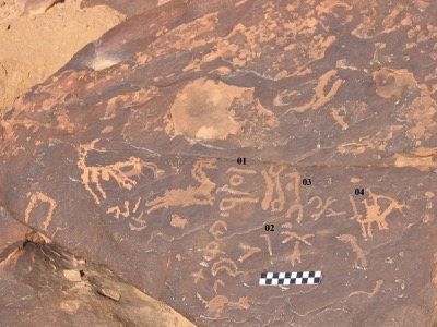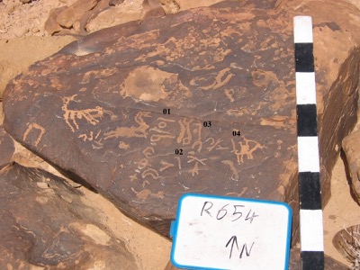 Corbett (2010: 345–346) commented: "As in R653.03, the last letter of PN1 could be read as r, although in both cases, the same individual has carved his name. To the right of the text is a later drawing of a camel. There is a rough linear mark below the inscription".